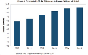 據(jù)IHS iSuppli公司的電視研究報(bào)告,隨著青睞先進(jìn)電視技術(shù)的中產(chǎn)階級(jí)不斷壯大,今年俄羅斯液晶電視出貨量預(yù)計(jì)強(qiáng)勁增長(zhǎng)10%。俄羅斯屬于所謂的金磚國(guó)家(BRIC),是一個(gè)重要市場(chǎng)。