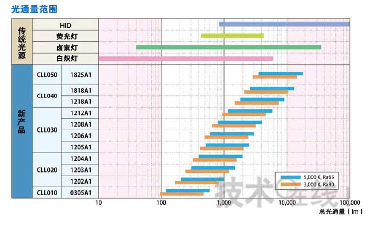 除了CLL-050系列外,西鐵城電子還發(fā)布了亮度最大分別為590lm、1970lm、5780lm以及1萬2915lm的不同封裝的4個系列。包括CLL-050系列在內(nèi)的5個系列產(chǎn)品,覆蓋了95~1萬7675lm的亮度范圍,可以應對從10W白熾燈泡到300W汞燈的廣泛需求。