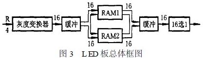 由此類推,把CRT 顯示的一幀單色畫面分成N場在L ED 點陣屏上顯示,每場顯示的時間為TPN ,在各場中,各像素由其對應的控制碼來控制L ED 的通斷,通過視覺的積分效應,就產生了整個畫面的灰度效果。