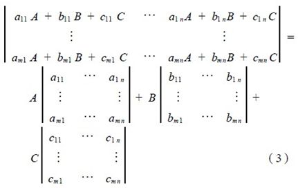 式(3) 中的各項分別代表紅、綠、藍單色圖像,是具有若干灰度級的,如果aij 、bij 、cij 的取值分別從0 到N ,那么,每一單色圖像的灰度級為N + 1。根據(jù)矩陣運算法則有