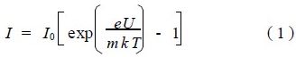 式中m 為復合因子, I0為反向飽和電流, UT =kT/e 稱為溫度電壓當量,在熱力學溫度T = 300 K時,UT = 26 mV1 在寬禁帶半導體中, 當I <0. 1 mA時,通過結內深能級進行復合的空間復合電流起支配作用,這時m = 2 ;電流增大后擴散電流占優(yōu)勢時m = 1.U 為外加電壓。