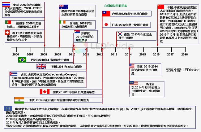 而2014年10月1日起禁止進(jìn)口和銷售60瓦及以上普通照明白熾燈相對來說更為重要 ,由于60W與60瓦到100瓦之間的白熾燈泡使用數(shù)量龐大,也是LED燈泡進(jìn)軍主照明市場的關(guān)鍵產(chǎn)品區(qū)塊,因此2014年以后將會是發(fā)展關(guān)鍵。以歐盟的腳步來看,已經(jīng)從2009年9月1日開始禁止其27個成員國購進(jìn)100瓦白熾燈,而日本 方面則是提出2012年全面禁用白熾燈,南韓則預(yù)計是2013年底禁用。