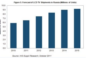 據(jù)IHS iSuppli公司的電視研究報告,隨著青睞先進(jìn)電視技術(shù)的中產(chǎn)階級不斷壯大,今年俄羅斯液晶電視出貨量預(yù)計強(qiáng)勁增長10%。俄羅斯屬于所謂的金磚國家(BRIC),是一個重要市場。