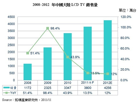 隨著2011年接近漸近尾聲,中國大陸LCD TV年銷售量預(yù)估將成長(zhǎng)13.5%,但與2009年的98.4%和2010年的43.9%成長(zhǎng)率相比,已不可同日而語。