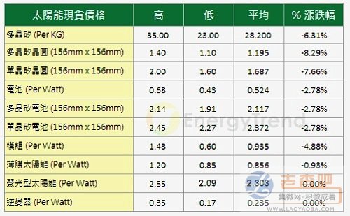 而在電池方面,最低價(jià)格仍來到每瓦0.43美元,平均價(jià)格則滑落到每瓦0.524美元,跌幅為2.78%;另外在模組方面,雖然矽晶太陽(yáng)能模組的平均價(jià)格持續(xù)下滑到每瓦0.935美元,跌幅為4.88%;而薄膜部分也是下滑的狀況,平均價(jià)格來到0.856美元,跌幅為0.93%。