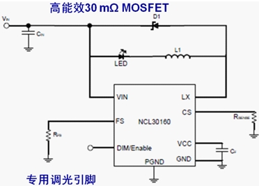 NCL30160是安森美半導體為驅動大功率LED推出的一款NFET遲滯降壓、恒流驅動器。它的電流提升到了1.5安培,損耗非常低,體積也更小,可最大限度地減少空間和成本。通過利用導通阻抗僅為55mΩ的內(nèi)部MOSFET以及100%占空比工作的能力,能夠提供能效高達98%的方案。最高1.4MHz的高開關頻率使設計人員可采用更小的外部元件,將電路板尺寸減至最小及成本降至最低。