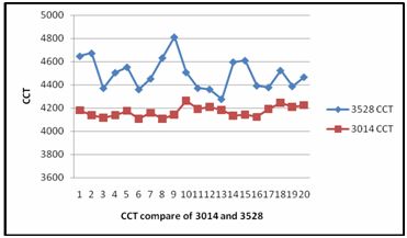 初始參數(shù)測(cè)試結(jié)果表明,在20mA電流驅(qū)動(dòng)下,3014LED的光通量比3528高,且其CCT集中度比3528LED好。另3014一般在30mA電流下驅(qū)動(dòng)使用,其光通量達(dá)到10~11Lm;如上節(jié)熱模擬顯示,3528LED散熱效果遠(yuǎn)不如3014LED,故其在大電流驅(qū)動(dòng)下,光通量必定會(huì)嚴(yán)重受到過(guò)高熱量的影響。因此相比水平散熱LED,垂直散熱LED具有不可比擬的優(yōu)勢(shì)。