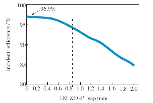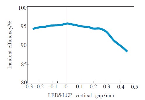 LED發(fā)光面和LGP入光面兩者之間的垂直距離通常會被忽略,但如果兩者之間的距離過大,也會嚴(yán)重影響入射效率。通過試驗發(fā)現(xiàn),兩者之間的距離在±0.2mm范圍內(nèi)時,入射效率變化緩慢,且保持在95%左右,所以控制LED發(fā)光面和LGP入光面的垂直距離在±0.2mm范圍內(nèi)即可。