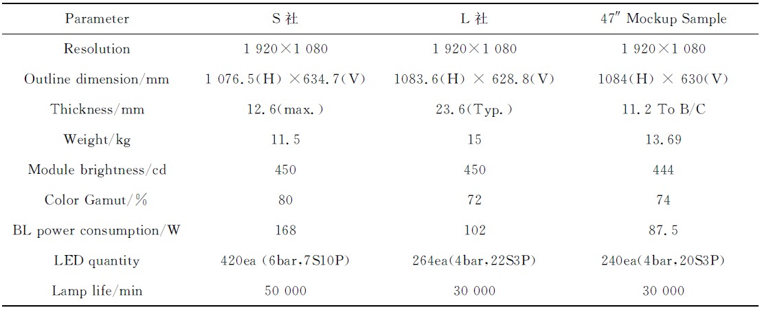 本文中設(shè)計的樣品在保證了光學(xué)性能的前提下,實現(xiàn)了低功耗的目標(biāo),達(dá)到了《平板電視能效限定值及能效等級》中規(guī)定的一級能耗,產(chǎn)品的厚度和色域也具有一定的優(yōu)勢。