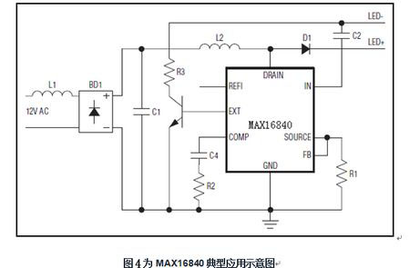 而MAX16840芯片有3個重要引腳功能:FB引腳電壓可檢測輸入電流,并調節(jié)其平均值;而輸入引腳(REFI)用于設置輸入電流值,引腳電壓低于特定門限時,輸入電流與該電壓成正比,電壓超過特定門限時,輸入電流將置于固定的預置水平。據(jù)此利用REFI的非線性特性,連接一個NTC電阻,即可得到熱折返保護;IN引腳具有內部過壓保護,避免內部開關MOSFET在LED串開路或LED串電壓過高時損壞;它帶有一個獨立的EXT引腳,確保低輸入電壓開啟時提供一個觸發(fā)啟動電流,以配合電子變壓器正常工作。EXT驅動外部npn晶體管,一旦IN跌落到5.5V UVLO門限以下,將EXT拉至地電平,外部npn晶體管關斷。其IC采用3mm x 3mm、10引腳、TDFN封裝,-40°C至+125°C工作溫度范圍。圖4為MAX16840典型應用示意圖。它被廣泛應用于MR16及其它12V交流或直流輸入LED照明之中。