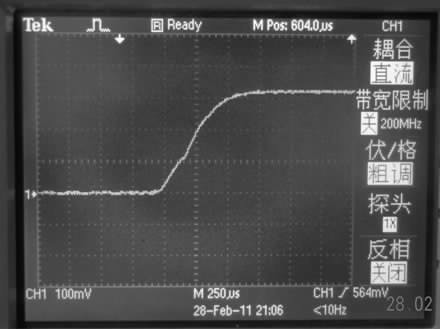 通過模擬可初步選擇40 mH 的電感作為驅(qū)動(dòng)電路所用, 圖3 是用示波器采到的電壓波形圖, 此電壓是電路中串聯(lián)了一個(gè)20 Ω 的電阻上的電壓, 穩(wěn)定后電壓為340 mV, 即電路中電流為17 mA.因?yàn)閷?shí)際電路中電流有損耗, 所以實(shí)際電流值比模擬電流值偏小, 但整個(gè)電流的變化趨勢(shì)與模擬基本一致。