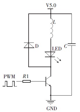 圖1 所示為驅(qū)動(dòng)電路, 電感值的選擇以及PWM 波的頻率選擇在此驅(qū)動(dòng)電路中相當(dāng)重要。選擇C8051330 芯片作為PWM 波的輸出, 采用定時(shí)器翻轉(zhuǎn)控制高低電平的時(shí)間,從而控制PWM 波的占空比。