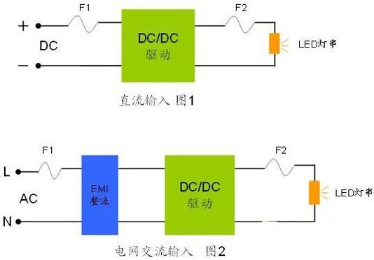 面對LED照明的眾多應(yīng)用領(lǐng)域,由于市場并沒有形成統(tǒng)一的規(guī)范,存在多種多樣的驅(qū)動解決方案,但是萬變不離其中,從過流保護的角度來看大體上根據(jù)燈體的輸入電流來可以分為:直流輸入和電網(wǎng)交流輸入兩種最基本的類型,兩種類型的主要區(qū)別在于驅(qū)動電源是否有交流轉(zhuǎn)直流的模塊。當然市場上也有很多電阻、阻容降壓等低成本解決方案,沒有EMI整流和恒流驅(qū)動的模塊,但是由于初級端保險絲的選用要求與圖2是一致,在此歸入第二種類型。
