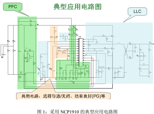 圖1是采用NCP1910的典型應(yīng)用電路圖共用電路,它包括遠程PFC段、LLC段,以及實現(xiàn)導(dǎo)通/關(guān)閉、功率良好(PG)等的共用電路。
