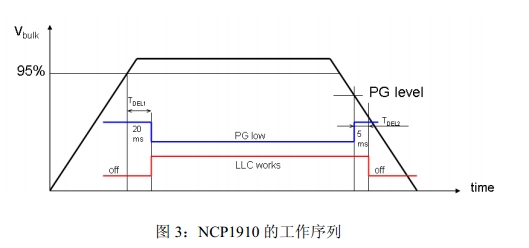 NCP1910的工作序列如圖3所示,如果PFC未就緒,LLC就不能啟動;一旦PFC就緒,就會開始一段20ms的延遲;延遲結(jié)束后PGout引腳假定為低電平,LLC可以開始工作。在撥除交流輸入關(guān)閉電源時Vbulk降低,到達PG信號時,PGout引腳被釋放(開路);如果Vbulk到達LLC停止電平,LLC停止工作;或者如果Vbulk緩慢下降,如處在輕載狀態(tài),LLC會在PGout引腳被釋放5ms后停止工作。