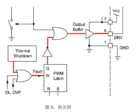 熱關(guān)閉(TSD):過熱保護功能有助于實現(xiàn)良好的電源設(shè)計。當(dāng)結(jié)點溫度超過140℃時,該功能激活,驅(qū)動器變?yōu)榈碗娖剑唤Y(jié)點溫度降到典型值30℃時器件恢復(fù)工作。