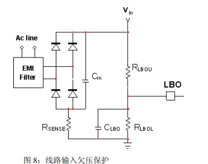 1.線路輸入欠壓(BO)保護:線路輸入欠壓引腳接收部分平均輸入電流,因此,感測到低線路電壓時,50ms定時器就會激活。這段消隱時間用于幫助符合維持要求。如果線路電壓在50ms消隱延遲結(jié)束時仍處于低電平,輸入欠壓保護就被觸發(fā),PFC驅(qū)動器關(guān)閉,VCTRL引腳接地,可使器件在故障消失時使用軟啟動。