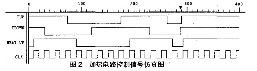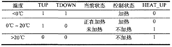 當環(huán)境溫度低于0℃ ,此時TUP與TDOWN均為高電平,F(xiàn)PGA/CPLD輸出高電平HEAT_UP,加熱電路工作。當環(huán)境溫度介于0℃與20℃之間時,如果此時正在加熱,則繼續(xù)加熱,如果當前未加熱,則無需加熱。當環(huán)境溫度高于20℃時,則停止加熱。