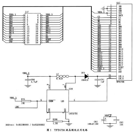 TFT 液晶接口電路采用PACK板形式與主板連接, 其接口定義如圖1 所示。將TFT6758 液晶顯示模塊的RESET 引腳連接到J1 連接器上, 使用LPC2292 的P0.22 控制液晶模塊復位。TFT6758 液晶顯示模塊的CS、WR 和RD 引腳均連接到J1 連接器上, 與主板的LPC2292 的片選、寫和讀信號連接。而RS 引腳則使用A1 連接, 當A1 為高電平時為數(shù)據(jù)操作, 當A1 為低電平時為命令( 索引) 操作,即使用兩個不同的地址來區(qū)別向TFT6758 液晶模塊發(fā)送命令還是發(fā)送數(shù)據(jù)。TFT6758 液晶模塊片選信號: LCM_nCS0; 0x83200000~0x833FFFFF; 索引/ 指令操作地址為: 0x8320000; 數(shù)據(jù)操作地址為:0x83200002。