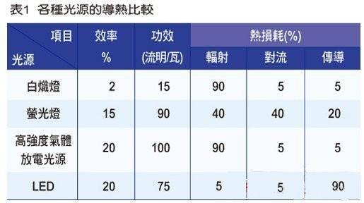 在此情況下,約20%輸入功率轉(zhuǎn)換為光,80%則轉(zhuǎn)換為熱。這取決于多種因素,發(fā)熱可能與底層不規(guī)則以及聲子發(fā)射、密封、材料等有關(guān)。在LED產(chǎn)生的總熱量中,有90%透過傳導(dǎo)傳輸。表1為耗散來自LED接面的熱量,傳導(dǎo)是導(dǎo)熱的主要通道,因?yàn)閷?duì)流和輻射僅占全部熱傳輸約10%。比如一個(gè)LED可能轉(zhuǎn)換近10.72瓦熱量(13.4瓦×0.8)。其中,9.648瓦(10.72瓦×0.9)透過傳導(dǎo)從LED接面?zhèn)鬏敾蜻w移。顯然,LED光源需要精確的功率和熱管理系統(tǒng),因?yàn)榕c其他光源相比,提供給LED的電能大部分轉(zhuǎn)換為熱量。如果沒有適當(dāng)?shù)臒峁芾恚@種熱量會(huì)影響LED壽命和色彩輸出。同時(shí)由于LED驅(qū)動(dòng)裝置屬于硅組件,很快就會(huì)失效,因此必須配備故障安全備用過電流保護(hù)裝置。