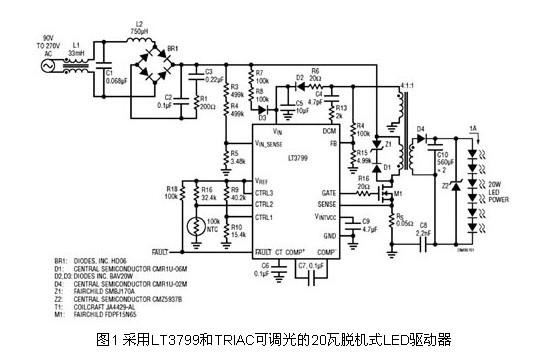 創(chuàng)造更精小并具成本效益解決方案LT3799運用具整個LED驅(qū)動電路(包括電磁干擾濾波器)的單級設計,僅需要四十個外部組件,讓解決方案簡單、配置面積精小和具成本效益等優(yōu)勢。圖1中20瓦電路的總尺寸僅為30毫米(mm)×75毫米,厚度僅為30毫米,非常適用于多種LED應用。透過改變幾個外部組件,這個電路就可以進一步為120VAC、240VAC甚至377VAC應用或幾乎任何常見的AC輸入而優(yōu)化。