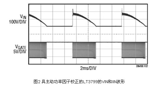 透過使線路電流跟隨施加的正弦波電壓,這種高功能整合的驅(qū)動電路實現(xiàn)了高功率因子,并且滿足了IEC 61000-3-2 C類照明設備諧波要求。如果所吸取的電流與輸入電壓成正比,就能實現(xiàn)等于1的功率因子。其用一個從輸入電壓產(chǎn)生并與輸入電壓成比例的電壓調(diào)制峰值開關電流。如圖2所示,這種方法提供0.98或更高的功率因子。一個小帶寬回饋環(huán)路保持對輸出電流的調(diào)節(jié),而且不會使輸入電流失真。