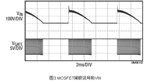 當TRIAC調(diào)光器處于斷開狀態(tài)時,其實不是徹底斷開的。有相當大的漏電流通過其內(nèi)部濾波器流至LED驅(qū)動器。這個電流為LED驅(qū)動器的輸入電容器充電,進而導致LED隨機開關和閃爍。過往的解決方案是增加一個泄能電路,該電路包括一個大且昂貴的高壓金屬氧化物半導體場效晶體管(MOSFET)。LT3799將變壓器一次側(cè)繞組和主開關用作泄能電路,因此無需這類MOSFET或其他任何額外的組件。如圖3所示,當TRIAC斷開時,MOSFET閘極訊號為高,且MOSFET接通,進而泄放掉漏電電流,并保持輸入電壓為 0伏特(V)。TRIAC一導通,MOSFET就無縫地變回正常的供電組件。
