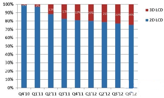 根據(jù)NPD DisplaySearch的調(diào)查,在元旦期間的主要城市賣場,3D液晶電視在零售終端滲透率甚至高達(dá)40%;而整體3D液晶電視出貨滲透率可望在2012年第一季超過20%;該機(jī)構(gòu)在全球電視出貨與預(yù)測季報(Quarterly Advanced Global TV Shipment and Forecast Report)中預(yù)測,到2012年第四季,中國大陸 3D液晶電視滲透率可達(dá)25%。