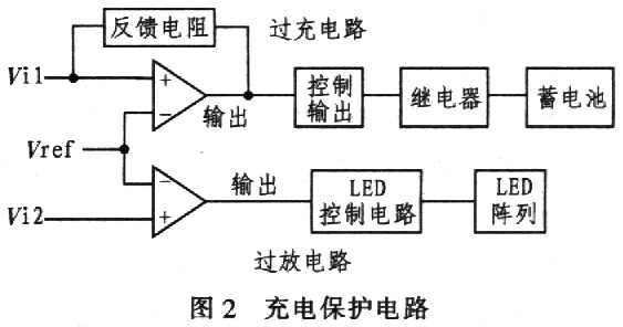 充電保護(hù)電路由兩個(gè)運(yùn)算放大器組成,電路如圖2所示。圖2中Vi1、Vi2分別為蓄電池的輸出電壓,Vref為運(yùn)算放大器的比較參考電壓,其具體值根據(jù)不同的要求由用戶設(shè)定。在實(shí)際設(shè)計(jì)過(guò)程中,要注意圖2中反饋電阻的選取,反饋電阻越大,控制輸出所對(duì)應(yīng)的輸入Vi回差值越小。