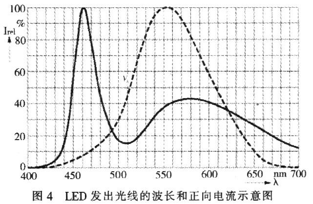 白光LED設(shè)計(jì)中采用了一個(gè)小竅門。在發(fā)射藍(lán)光的InGaN基料上覆蓋轉(zhuǎn)換材料,這種材料在受到藍(lán)光激勵(lì)時(shí)會(huì)發(fā)出黃光。于是得到了藍(lán)光和黃光的混合物,在肉眼看來(lái)就是白色的,圖4為L(zhǎng)ED發(fā)出光線的波長(zhǎng)和正向電流示意圖。由圖4可以看出:白光LED的發(fā)射波長(zhǎng)(實(shí)線)包括藍(lán)光和黃光區(qū)域的峰值,但是在肉眼看來(lái)就是白色。肉眼的相對(duì)光敏感性(虛線)如圖4所示。