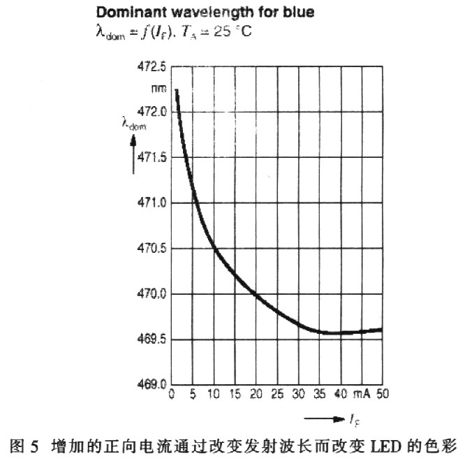 但是,采用InGaN技術(shù)的LED并不像標(biāo)準(zhǔn)綠光、紅光和黃光那樣容易控制。InGaN LED的顯示波長(zhǎng)(色彩)會(huì)隨著正向電流而改變(如圖5所示)。例如,白光LED所呈現(xiàn)的色彩變化產(chǎn)生于轉(zhuǎn)換材料的不同濃度,且藍(lán)光發(fā)光InGaN材料隨著正向電壓的變化而產(chǎn)生波長(zhǎng)變化。