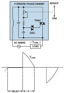 一個標準的正相調(diào)光器包含一個TRIAC、一個DIAC(二極管交流)和一個RC(電阻/電容)電路(圖1)。電位計調(diào)節(jié)電阻值,得到的RC時間常數(shù)用于控制TRIAC導通前的延遲量,或觸發(fā)角。當TRIAC導通時,時間部分就是導通角θ。得到的電壓波形就是一個切相的正弦曲線。