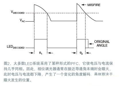 由于大多數(shù)LED系統(tǒng)都采用了某種形式的PFC,輸入電流通常能很好地追隨輸入電壓,這意味著當電壓與電流同時下降時,相位調(diào)光器經(jīng)常會導通角的末端瞎火(圖2)。這種瞎火會根據(jù)其發(fā)生的時點,產(chǎn)生一種不斷變化的導通角解碼。