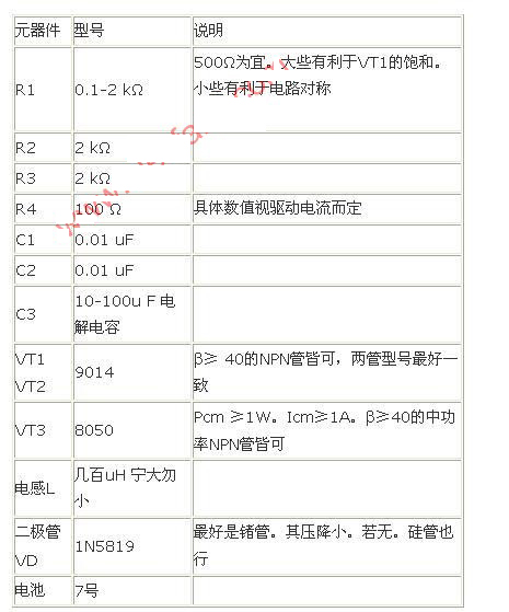 現(xiàn)進行估算。驅(qū)動一個LED約要100mW。電源的Po約為20mW。為了保證供給,按P=100mW計算。取η=80%,再隨便找一個幾百uH的電感,如500 uH:另一方面,根據(jù)能量守恒。3.3V約為1.2V的3倍。再由于效率問題。電感的驅(qū)動電流差不多要LED工作電流的3-4倍,就取為120mA,這樣一來。便可算出振蕩頻率為34kHz左右,這樣,取R=2kΩ,C=0.01 uF便能達到要求。確定參數(shù)時。頻率可高不可低,電感寧大勿小,這樣才能保證輸出功率足夠大,才能有足夠的調(diào)節(jié)空間。