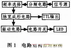 對(duì)水下成像系統(tǒng)而言,光源的選擇至關(guān)重要,光源的穩(wěn)定性、均勻性、響應(yīng)速度及其光波波長范圍是系統(tǒng)成像的關(guān)鍵。采用藍(lán)光LED所發(fā)出光光經(jīng)過水介質(zhì)——目標(biāo)反射——水介質(zhì)——接收光學(xué)系統(tǒng),最終在成像傳感器(CCD,ICCD)上成像。這就決定了LED必須工作在快脈沖驅(qū)動(dòng)方式下,目前市場(chǎng)上的驅(qū)動(dòng)電路一般均丁作在慢脈沖驅(qū)動(dòng)模式(μs量級(jí)),遠(yuǎn)不能滿足我們的要求。因此,我們必須自己解決快脈沖驅(qū)動(dòng)電路這一難題,尤其是實(shí)現(xiàn)以ns量級(jí)的大功率快脈沖來驅(qū)動(dòng)大功率的LED?;谶@種實(shí)驗(yàn)實(shí)際需求,我們研究開發(fā)了此種快脈沖驅(qū)動(dòng)電路。該電路的基本功能是產(chǎn)生低頻、快速、大功率驅(qū)動(dòng)電流脈沖信號(hào),輸出脈沖的頻率與周期精確度高,穩(wěn)定性好,脈沖信號(hào)寬度在20~100 ns內(nèi)分5檔可調(diào),輸出在50 Hz的基準(zhǔn)頻率下工作。脈沖信號(hào)通過驅(qū)動(dòng)電路,輸出一個(gè)快脈沖信號(hào)驅(qū)動(dòng)輸出電流開關(guān),產(chǎn)生一個(gè)大電流脈沖信號(hào)驅(qū)動(dòng)一個(gè)大功率LED。為了達(dá)到設(shè)計(jì)要求和目的,我們采用晶振電路產(chǎn)生高精度頻率/周期基準(zhǔn)脈沖作為內(nèi)置信號(hào)源,通過對(duì)基準(zhǔn)脈沖進(jìn)行多次分頻,產(chǎn)生所需頻率的輸出脈沖信號(hào),這樣可以獲得頻率穩(wěn)定的脈沖信號(hào),同時(shí)實(shí)現(xiàn)了頻率選擇。經(jīng)過分頻后的脈沖信號(hào)再經(jīng)過脈沖寬度成形電路實(shí)現(xiàn)脈寬調(diào)節(jié),然后經(jīng)過電流開關(guān)電路,產(chǎn)生大電流脈沖,使LED發(fā)光。該驅(qū)動(dòng)電路主要由以下幾個(gè)部分組成:信號(hào)源、分頻電路、頻率選擇、脈沖寬度電路、TTL輸出、驅(qū)動(dòng)電路和電流開關(guān)電路。其框圖如圖1所示。