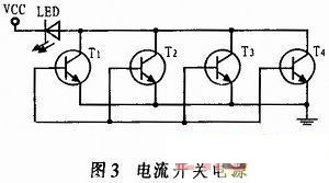 通過成形電路的信號(hào),控制大功率藍(lán)光LED發(fā)光,驅(qū)動(dòng)信號(hào)控制電流開關(guān)。電流開關(guān)選用一種大功率高頻三極管,為了滿足LED驅(qū)動(dòng)電流的需求,將4只三極管并聯(lián),使流過LED的脈沖電流最大達(dá)到2.5 A,保證了LED在額定功率下工作,達(dá)到穩(wěn)定光源的目的。在輸入驅(qū)動(dòng)信號(hào)的作用下,三極管進(jìn)入導(dǎo)通狀態(tài),LED兩端產(chǎn)生一定的壓降,大電流流過LED,使大功率藍(lán)光LED發(fā)光,作為距離選通水下成像系統(tǒng)的光源,電路如圖3所示。