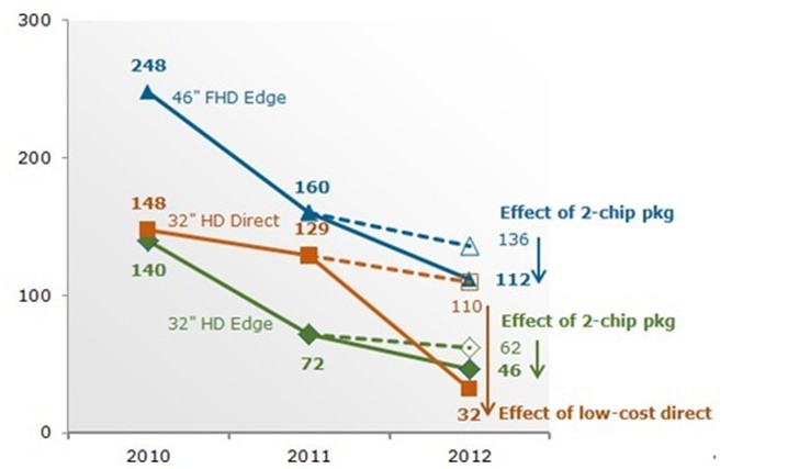 根據(jù)NPD DisplaySearch資深總監(jiān)Yoshio Tamura指出,LED背光面板在液晶電視滲透率較去年預期低了7%,主要是受到LED價差的影響。據(jù)調(diào)查,2011年第四季32寸電視面板中,LED背光源模塊的價格比CCFL高42%,但我們原本預期應是低27%。因此,電視廠商轉(zhuǎn)而改變原本直下式LED背光源液晶電視上的策略。與其顧及高畫質(zhì),電視廠商轉(zhuǎn)而選擇種相對低功耗但成本較低的新型LED液晶電視作為銷售特點,同時將增加與CCFL背光液晶電視,甚至傳統(tǒng)CRT映像管電視的競爭力。