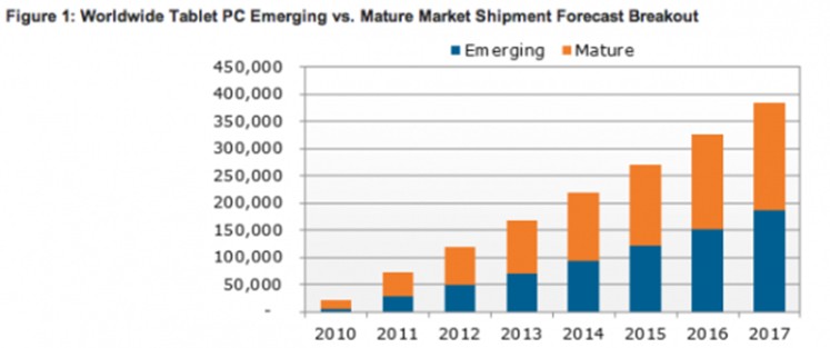 雖然那些數(shù)據(jù)本身就已十分驚人,但更令人關(guān)注的是,大多數(shù)新增的銷量將主要來(lái)自新興市場(chǎng)。預(yù)計(jì)到2017年,新興市場(chǎng)上平板電腦的銷量所占份額將由2011年的36%上升到到46%。