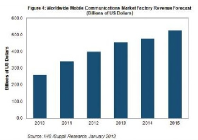 2012年移動通信市場的工廠營業(yè)收入預(yù)計(jì)達(dá)到3980億美元,比去年的3408億美元增長17%。盡管今年的增長速度比2011年的32%有所放緩,但總體市場并未顯示出即將下滑的跡象。預(yù)計(jì)明年將保持兩位數(shù)的增長速度,工廠營業(yè)收入到2015年將突破5000億美元,如圖所示。工廠營業(yè)收入是指制造商通過向渠道銷售設(shè)備而獲得的收入,在本案中,廠商銷售的是移動通信設(shè)備,如智能手機(jī)以及其它類型的手機(jī),或者路由器等無線基礎(chǔ)設(shè)備。