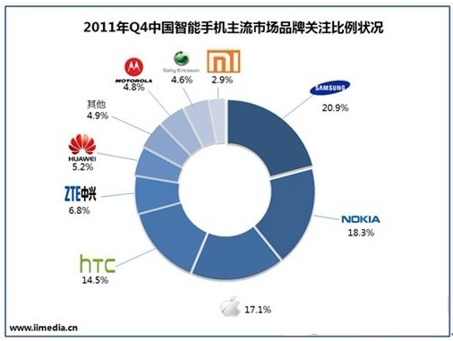 2011Q4中國智能手機市場主流市場品牌關注比例狀況