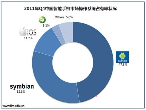 報告還顯示,在中國智能手機操作系統(tǒng)市場占有率方面,2011Q4中國智能手機市場主流的操作系統(tǒng)中,Symbian占32.3%,iOS占11.7%,而Android的表現(xiàn)非常令人欣喜,已經(jīng)飆升到47.3%,達到歷史空前水平。
