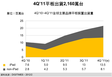 2011年第4季全球品牌平板裝置(Tablet)競(jìng)爭(zhēng)M型化程度較原本預(yù)期明顯。DIGITIMES Research分析師汪貫中分析,在高階產(chǎn)品部分,蘋果(Apple)感恩節(jié)祭出降價(jià)促銷,掃除2011年下半景氣轉(zhuǎn)弱、iPhone 4S造成預(yù)算排擠以及Kindle Fire來(lái)襲陰霾,刺激市場(chǎng)買氣,也使庫(kù)存有效降低,終端產(chǎn)品組裝出貨較原先預(yù)估增加250萬(wàn)臺(tái),達(dá)1,350萬(wàn)臺(tái)。