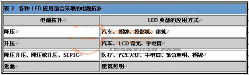 如同表2所示,LED已廣泛運(yùn)用于各領(lǐng)域,因此需要許多種類的電源拓?fù)洌С諰ED的應(yīng)用。一般而言,必須考慮輸入電壓、輸出電壓及對隔離的需求,以做出適當(dāng)選擇。