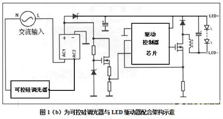 所以它是LED照明常用方法,見(jiàn)圖1(b)所示可控硅調(diào)光器與LED驅(qū)動(dòng)器配合架構(gòu)示意。