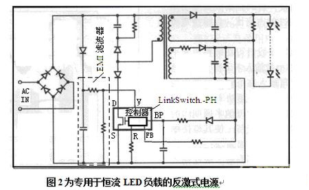 圖2所示為使用最新器件LinkSwitch.-PH控制器設(shè)計(jì)的反激式電源架構(gòu),它是專(zhuān)用于恒流LED負(fù)載的反激式電源。LED驅(qū)動(dòng)用恒流源有助于保證LED在發(fā)光的工作時(shí)間段光線亮度一致、不閃爍。