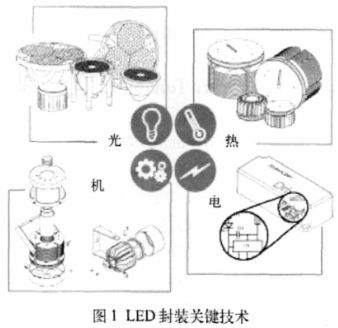 LED 的封裝技術(shù)實際上是借鑒了傳統(tǒng)的微電子封裝技術(shù),但LED 有其獨特之處,又不能完全按照微電子封裝去做。整個LED 封裝工藝主要包括封裝原料的選取、封裝結(jié)構(gòu)的設(shè)計、封裝工藝的控制以及光學(xué)設(shè)計與散熱設(shè)計,概括來講就是熱- 電- 機-光(T.E.M.O.),如圖1 所示,這是LED封裝的關(guān)鍵技術(shù)。