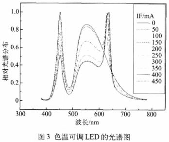 圖3為采用遠(yuǎn)方HASS-2000高精度快速光譜輻射計測量得到的色溫可調(diào)LED 的光譜圖,從圖中可以看出,隨著紅光LED 電流的變化(從0 到450mA),LED 的相對光譜也會隨之變化,LED 的光譜有三個峰值,分別在450nm、550nm和628nm,暖色溫的發(fā)光效率大于68lm/W,冷色溫的發(fā)光效率達(dá)到87lm/W。