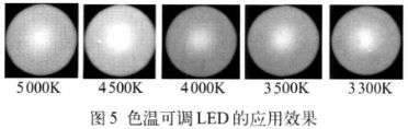 集成封裝的LED,由于工作電流較大,工作時產(chǎn)生大量的熱量,積聚在pn 結(jié)內(nèi)部的熱如不及時傳導(dǎo)出去,將導(dǎo)致器件溫度升高,溫度對LED的性能產(chǎn)生重要的影響,如色溫變化、波長紅移、正向壓降等。圖5 所示為色溫可調(diào)LED的應(yīng)用效果,將封裝好的色溫可調(diào)LED模塊安裝到100mm筒燈上,紅光LED加上不同的電流,得到筒燈的發(fā)光效果。筒燈連續(xù)點亮30min 后,測試筒燈上散熱器溫度為38℃,鋁基覆銅板上的溫度為38.5℃(室溫25.2℃),說明色溫可調(diào)LED 具有良好的散熱性能。