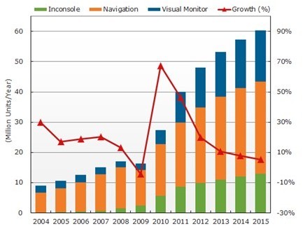 平板顯示器于車載的應(yīng)用已經(jīng)越來(lái)越盛行,如汽車導(dǎo)航、多功能駕駛儀表盤(pán)、以及后座娛樂(lè)顯示屏幕等。NPD DisplaySearch預(yù)測(cè)應(yīng)用于車載的面板出貨量將有望從2011年的4千2百萬(wàn)片成長(zhǎng)到2015年的6千2百萬(wàn)片。
