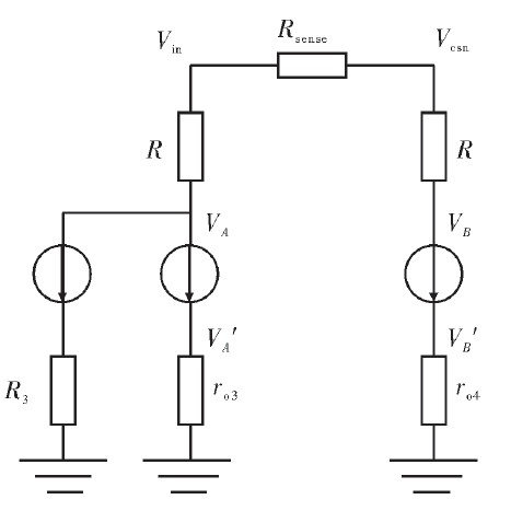 在實(shí)際電路中,VA對(duì)VB的匹配度直接影響采樣精度。圖3為簡化的小信號(hào)模型。圖4為實(shí)際電路圖。Vin與Vcsn為精確采樣電阻Rcsn兩端電壓,輸入范圍8~40 V;Vcc為芯片內(nèi)部5 V穩(wěn)定電源。